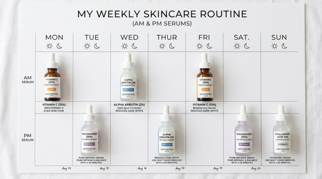 | Week 1 (Din 1-7) | Foundation | Vitamin C + Niacinamide + SPF |